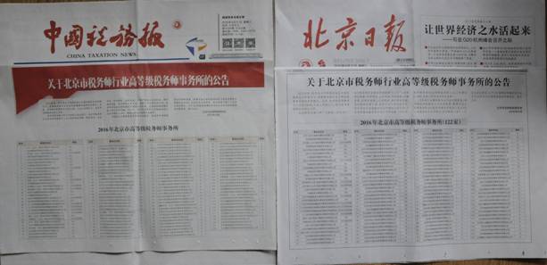 8月31日,北京市注冊(cè)稅務(wù)師協(xié)會(huì)分別在《中國(guó)稅務(wù)報(bào)》B1版、《北京日?qǐng)?bào)》第6版刊出《關(guān)于北京市稅務(wù)師行業(yè)高等級(jí)稅務(wù)師事務(wù)所的公告》。