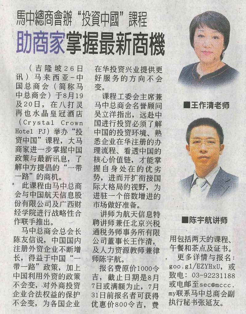 “投資中國”課程,是由馬中總商會與中國航天信息股份有限公司及廣西財經學院戰略合作聯手推出的項目內容。當地新聞媒體對“投資中國”課程給予了關注和報道。