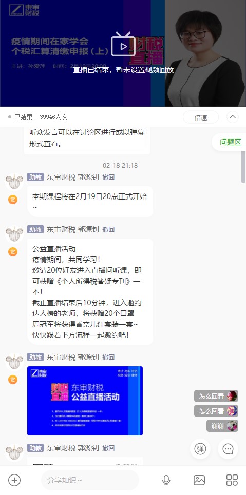 審信東審稅務師的財稅公益直播課程設置前沿,主題貼近實際,如疫情防控新政解析系列、公益捐贈、疫情期間在家學會個稅匯算清繳申報等,還涉及到香港等境外企業財稅。連續開播十天來,深受廣大客戶好評。期間交流互動,氣氛活躍。單場在線人次達39946人,并不斷持續攀升。