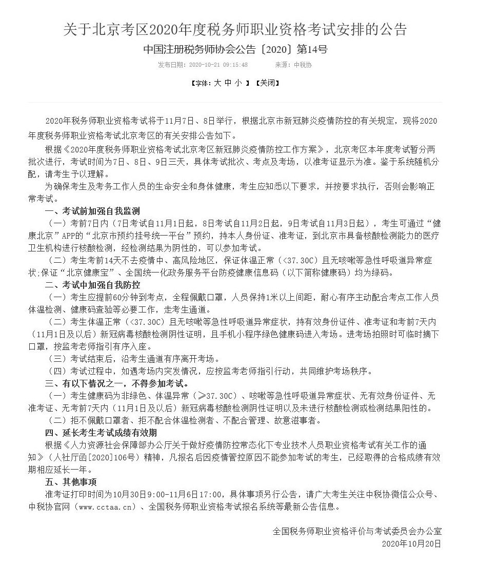 中國注冊稅務師協會關于北京考區2020年度稅務師職業資格考試安排的公告