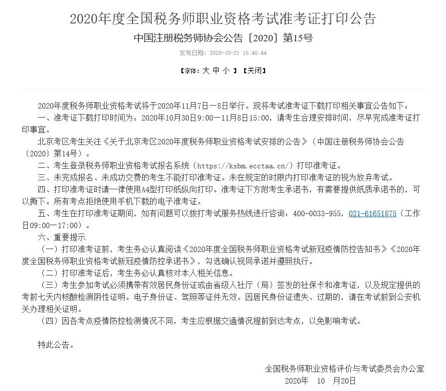 中國注冊稅務(wù)師協(xié)會2020年度全國稅務(wù)師職業(yè)資格考試準(zhǔn)考證打印公告